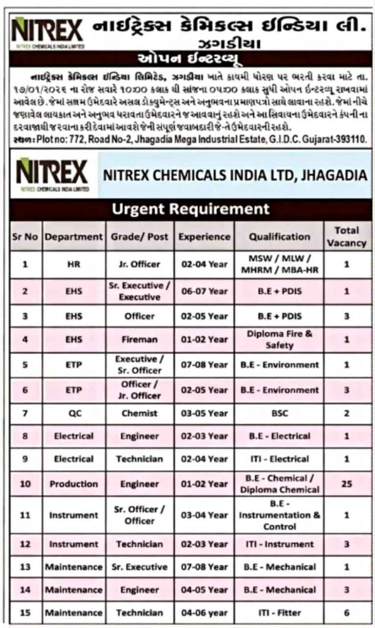 નાઈટ્રેક્સ કેમિકલ્સ ઈન્ડિયા લિમિટેડની આ ભરતી કેમિકલ, એન્જિનિયરિંગ અને ટેકનિકલ ક્ષેત્રમાં કામ કરવા ઈચ્છતા ઉમેદવારો માટે ઉત્તમ તક છે. કોઈ અરજી ફી નહીં, સીધી ઇન્ટરવ્યૂ પ્રક્રિયા અને અનેક ખાલી જગ્યાઓ હોવાના કારણે આ ભરતી ખાસ મહત્વની બની જાય છે. જો તમે જરૂરી લાયકાત અને અનુભવ ધરાવતા હો, તો 17 જાન્યુઆરી 2026ના રોજ ઓપન ઇન્ટરવ્યૂમાં અવશ્ય હાજર રહો.