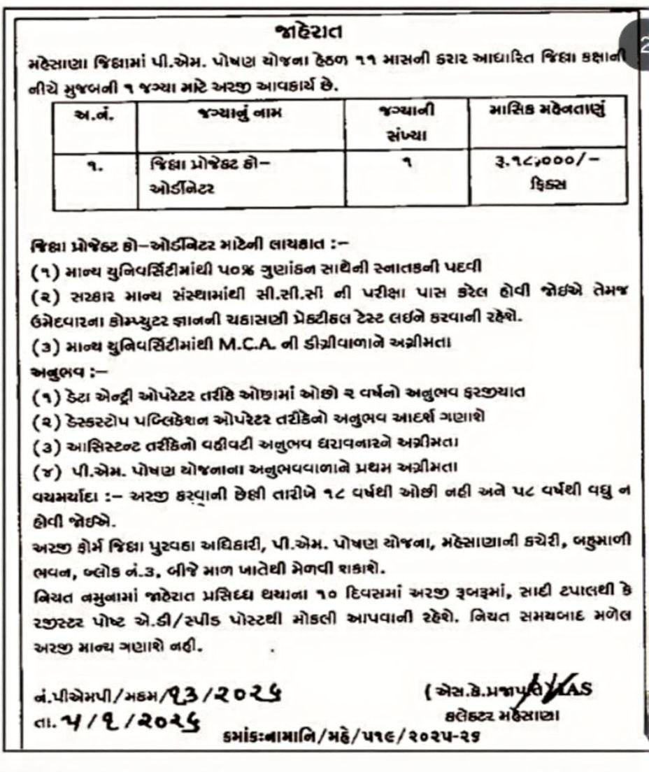 ગુજરાતમાં જિલ્લા PM પોષણ યોજના અંતર્ગત જિલ્લા કક્ષાએ કરાર આધારિત ભરતી જાહેર કરવામાં આવી છે. આ ભરતી 11 મહિનાના કરાર માટે રહેશે અને લાયક ઉમેદવારો પાસે આ એક સારું સરકારી વિભાગની તક બની શકે છે. ખાસ વાત એ છે કે અરજી માટે કોઈપણ પ્રકારની ફી લેવાતી નથી. ભરતી સંપૂર્ણપણે મેરિટના આધાર પર થશે, એટલે યોગ્ય ઉમેદવારોને સમાન તક મળશે.